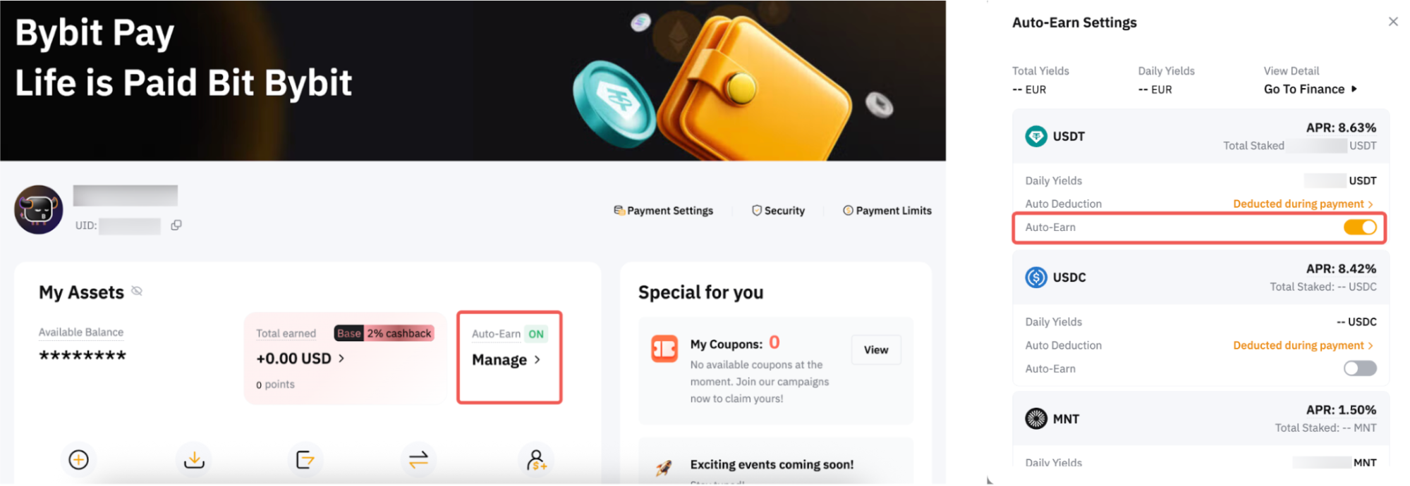 Step 2: On the Bybit Pay asset page, find the Auto-Earn switch button and toggle it on.