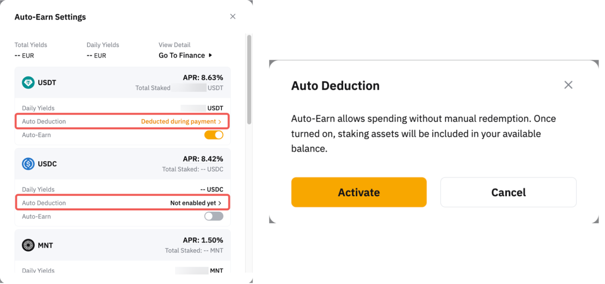 Enabling the Auto-Earn function will automatically use the transferable balance of your payment crypto asset (shown on each currency) in your Funding Account to subscribe to Flexible Term plans the next day.