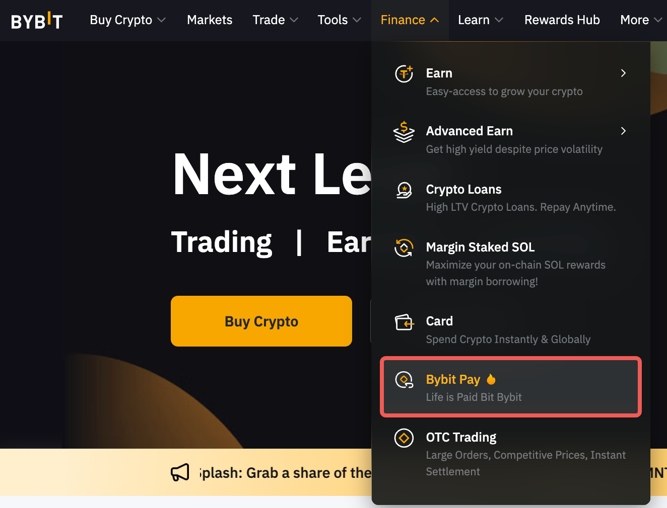 Step 1: Go to Finance in the upper left corner of the navigation bar on the Bybit page, then select Bybit Pay to enter the Bybit Pay page.