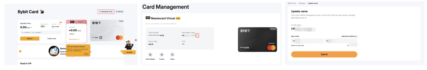 到我的 Bybit 卡 → 管理我的卡,然后单击持卡人姓名旁边的编辑图标。输入您的新名称,然后单击提交。