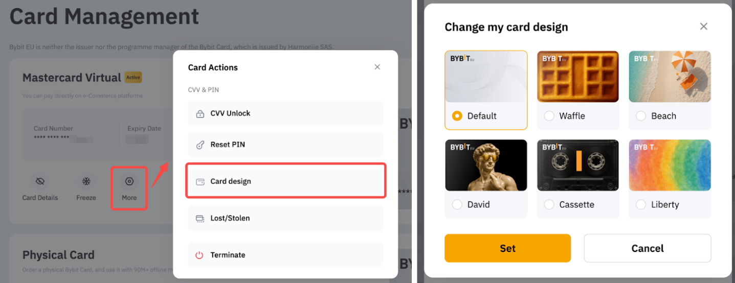 请前往卡片管理页面,点击更多并选择卡片设计。您将被引导至可用的虚拟卡设计图库。浏览图库,选择您的心仪的设计,然后单击设置。