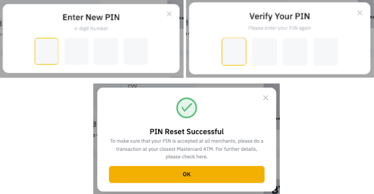 请注意,重置 PIN 码后,您必须首先使用新更改的 PIN 在 ATM 上完成交易(查询余额即可)。然后前往任意商户,使用芯片(插卡)和新的 PIN 进行交易。随后,您可以使用 Bybit Card 进行非接触式或新的 PIN 识别。
