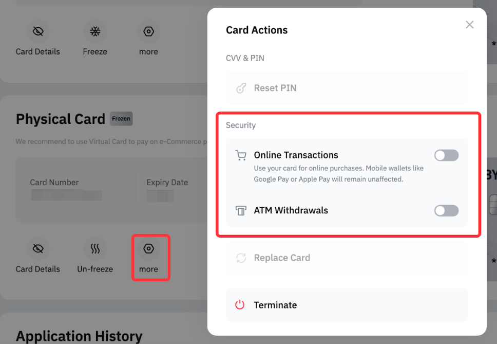 通过关闭这些选项,任何交易将被阻止,为卡提供了额外的安全保障。出于安全原因,启用这些选项时需要进行 2FA 验证,而关闭这些选项则不需要 2FA 验证。