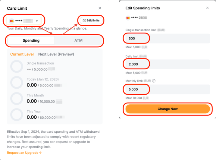 您可以通过卡片仪表板在当前级别限制内调整您的每日/每月/每年支付限额或 ATM 提款限额。