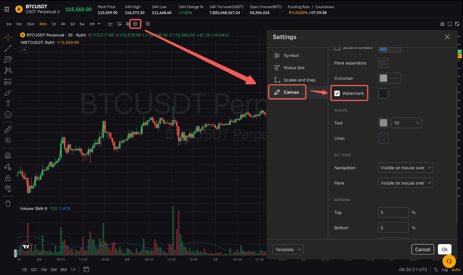在Bybit App上,您可以启用图表底部的标记指标。