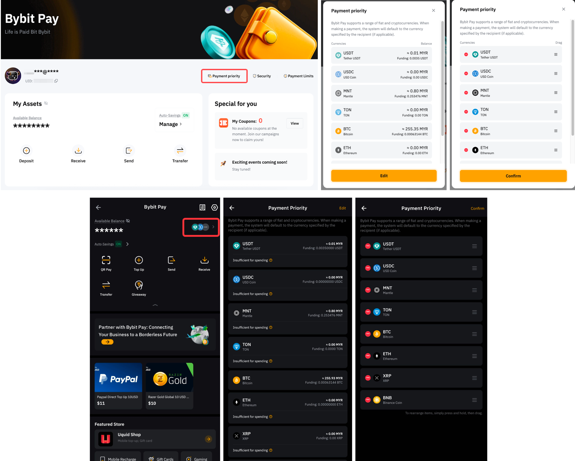 前往 Bybit Pay 页面 → 支付优先级 → 编辑 →点击移除/添加按钮,然后拖动调整顺序。