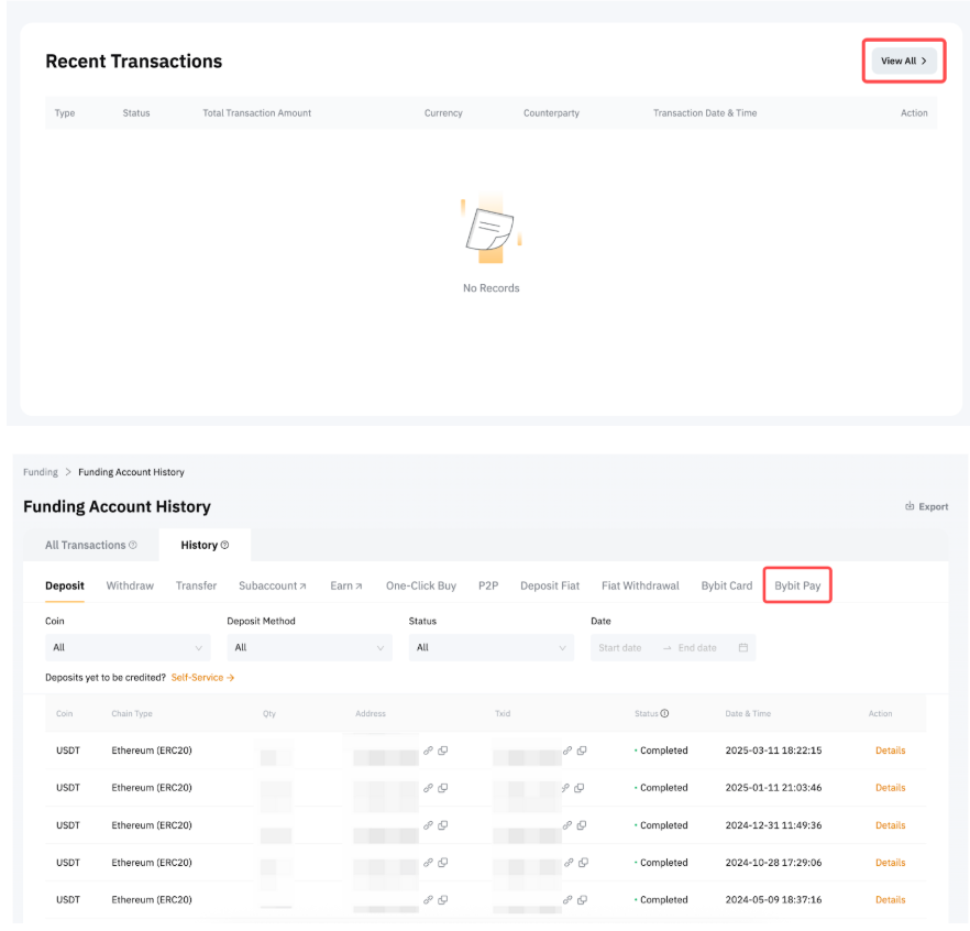在网站上,前往 Bybit Pay 页面,向下滚动至底部,找到近期交易,然后点击查看全部。或者,您也可以前往资金账户→History → Bybit Pay 找到交易记录。