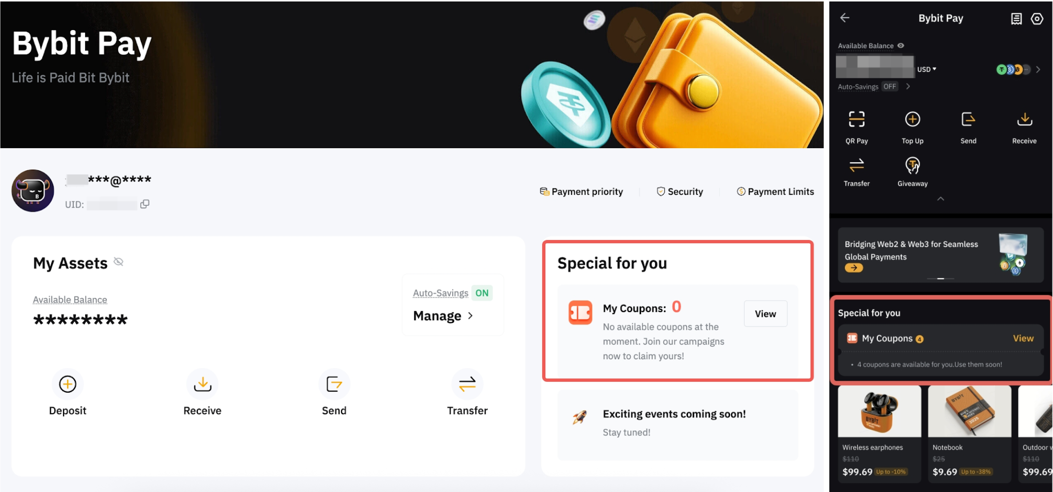 优惠券只能在向 Bybit Pay 商家付款或在精选商店购物时使用。您可以在此处查看可用优惠券,或访问福利中心,查看是否有任何正在进行的活动来获得奖励。