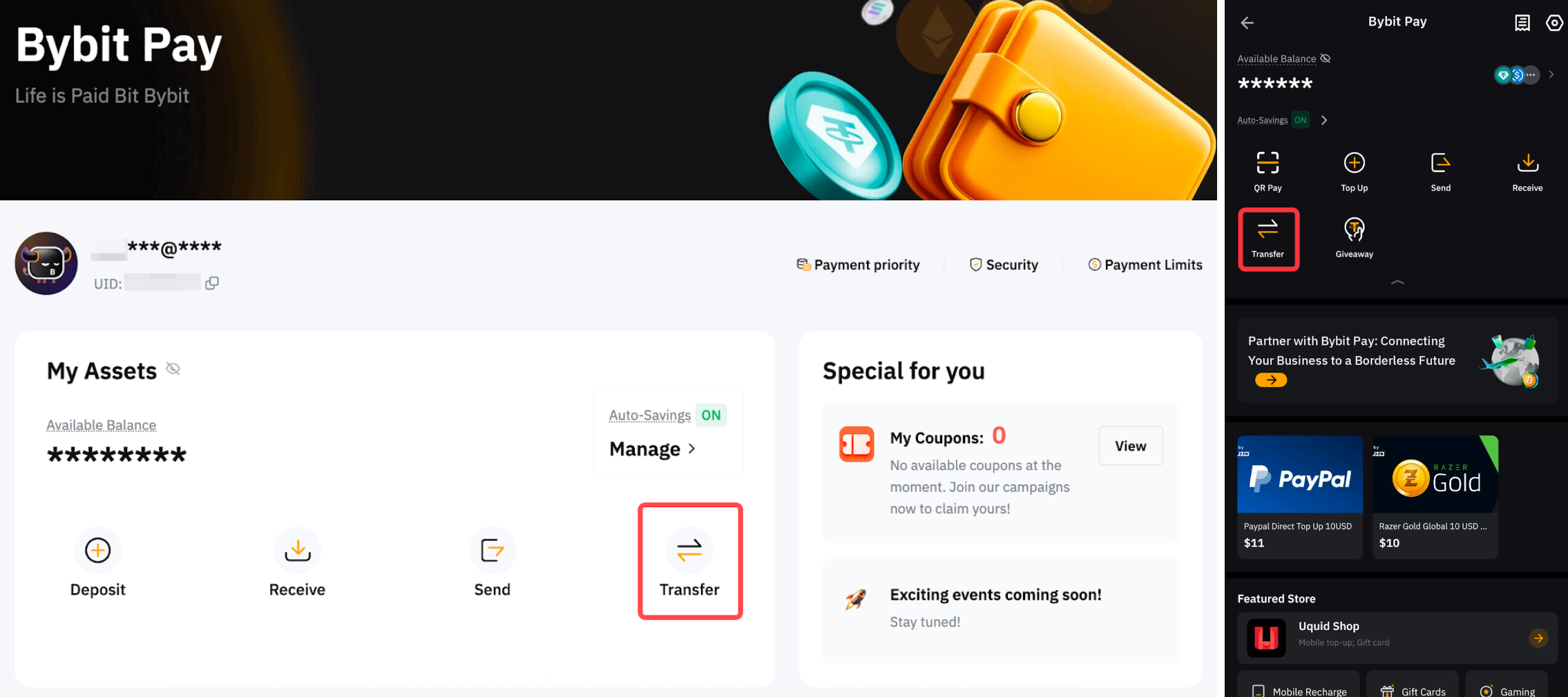 Bybit Pay 目前使用资金账户进行充值。提供充值选项,让您能够将资金划转至资金账户。您可以将所有支持的支付币种划转至资金账户。