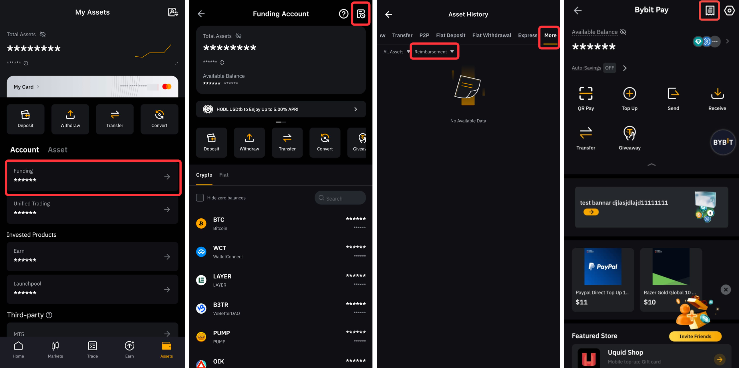 在 App 上,前往资产→ 资金账户 → 更多,然后将类型筛选为 Bybit Pay。或者,您也可以前往 Bybit 支付页面,点击右上角的纸质图标。