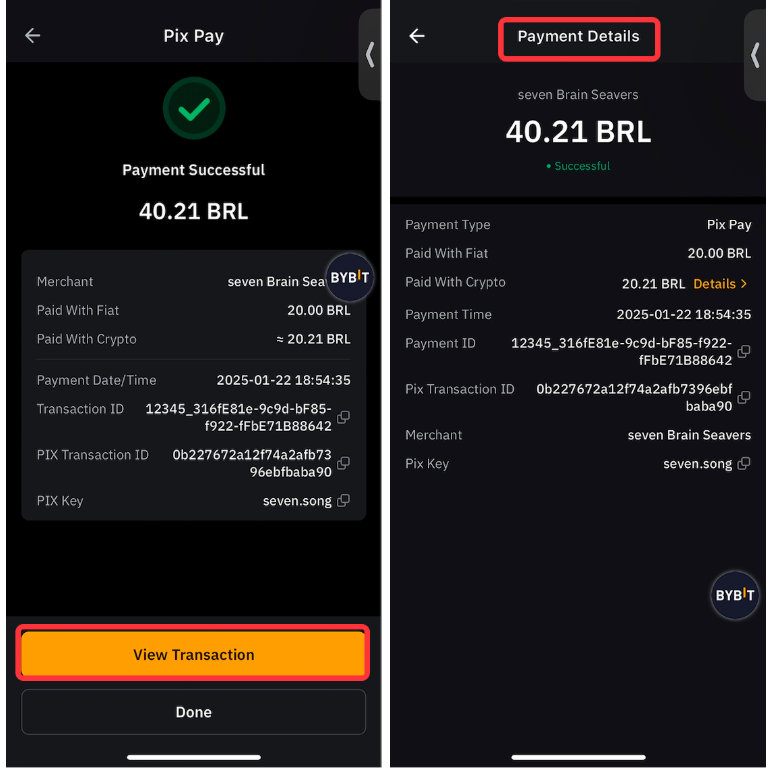 所有交易记录,包括使用 Bybit Card 的 PIX Pay 和 Bybit Pay,都将记录在 Bybit Pay 交易记录中。