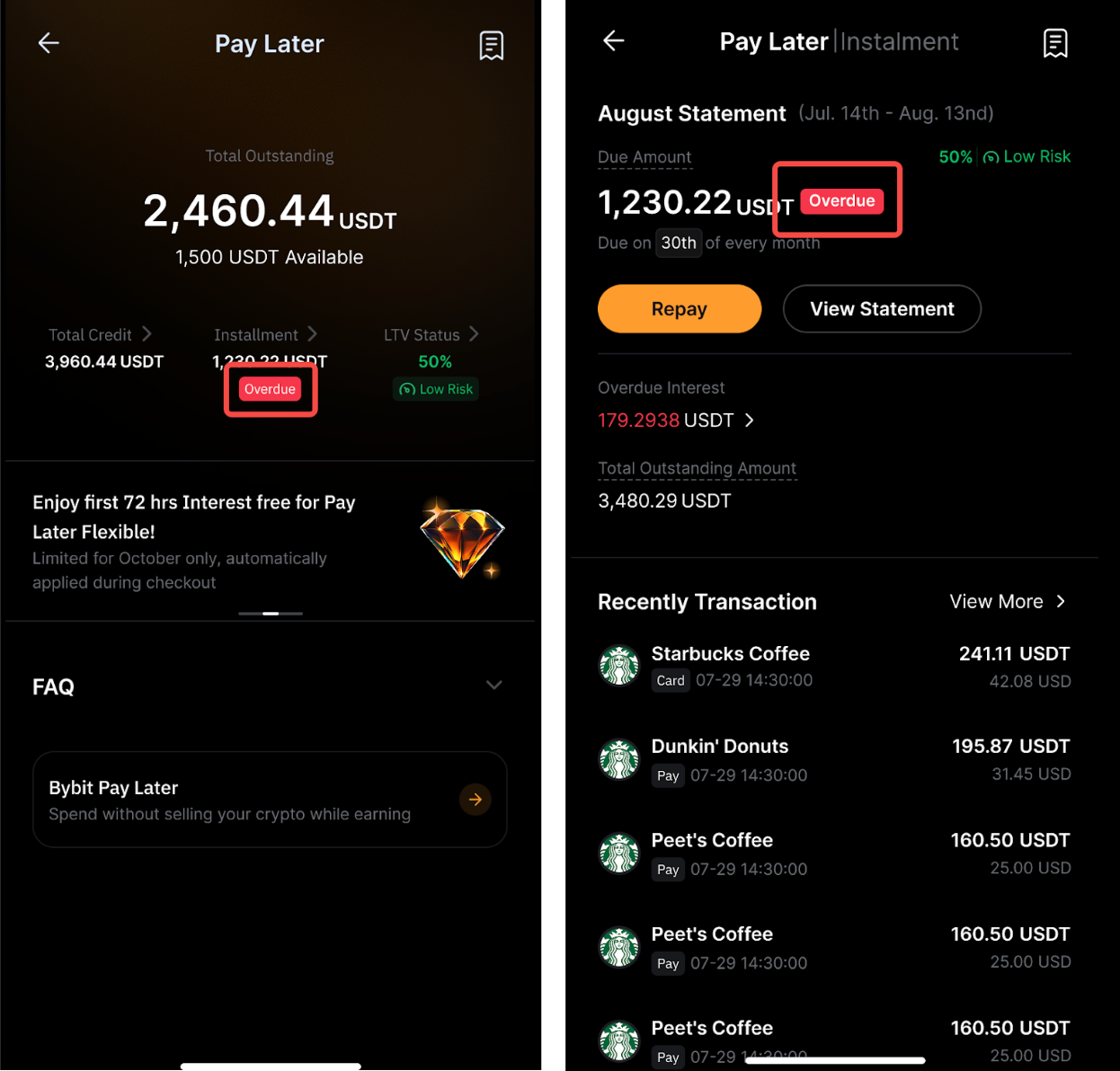 您将在“Bybit 先买后付”页面和“账单”页面上看到“逾期”标签。