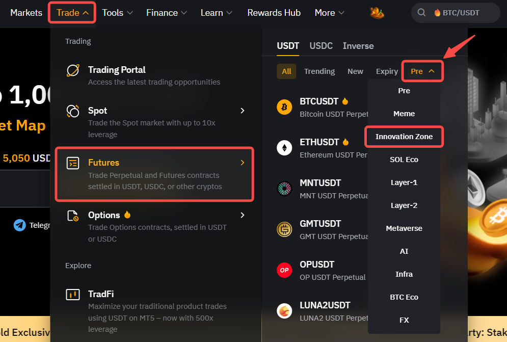 如要访问创新区及其合约,请点击交易 → 合约,然后在下拉菜单中选择创新区 (Innovation zone)。