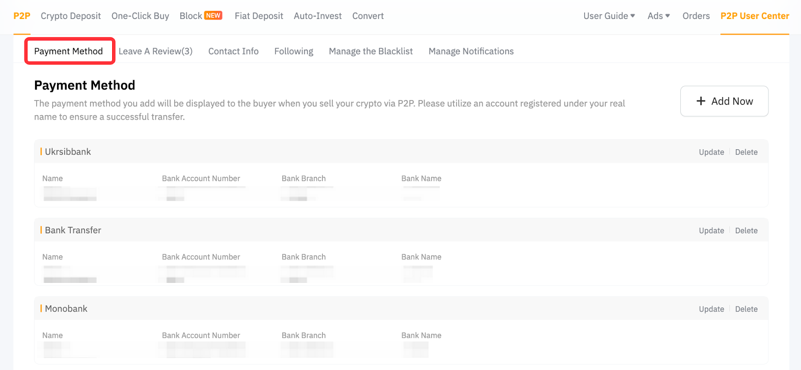 — 最多向交易对手显示 5 种支付方式。您可设定所需的支付方式,该支付方式将显示在P2P 用户中心付款方式