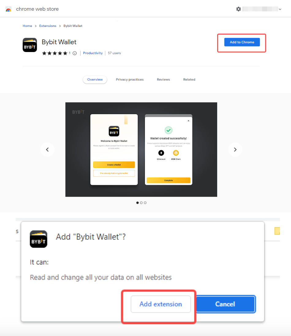第 2 步:点击添加至 Chrome,安装 Bybit 钱包扩展程序。然后,点击安装扩展程序。