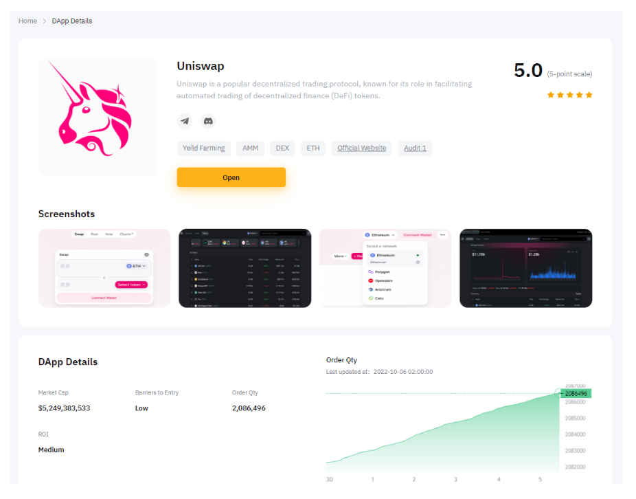 第 1 步:在 Bybit 钱包 首页的热门 Dapp 下选择 Uniswap,进入 DApp 详情页面。 然后,点击打开进入 Uniswap 界面。