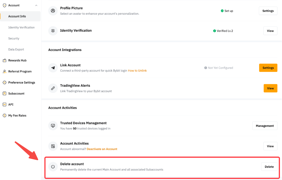 Bybit 推出了自助账户删除功能,用户可通过賬戶信息页面自行删除账户。