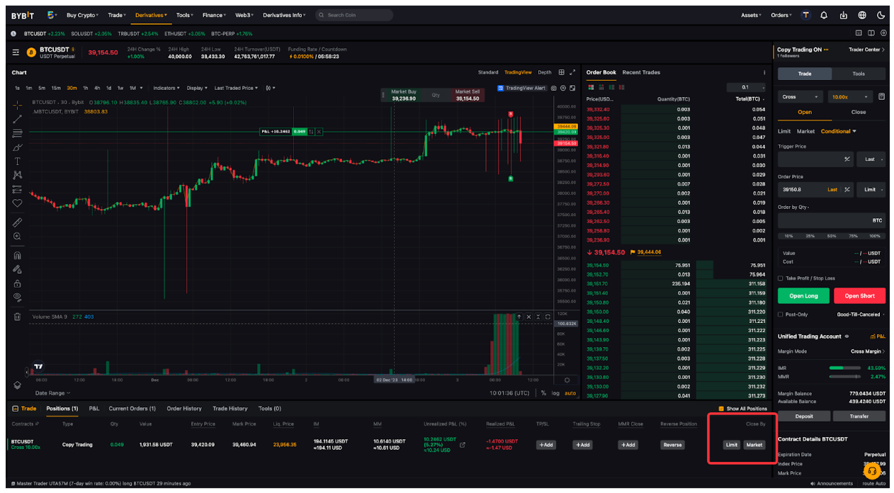 前往持仓区即可平仓,您可以选择以限价单或市价单平仓。如选择以条件单等其他策略平仓,双向持仓模式可用我们内置的止盈/止损功能完成,而单向持仓模式则在下单区完成即可。