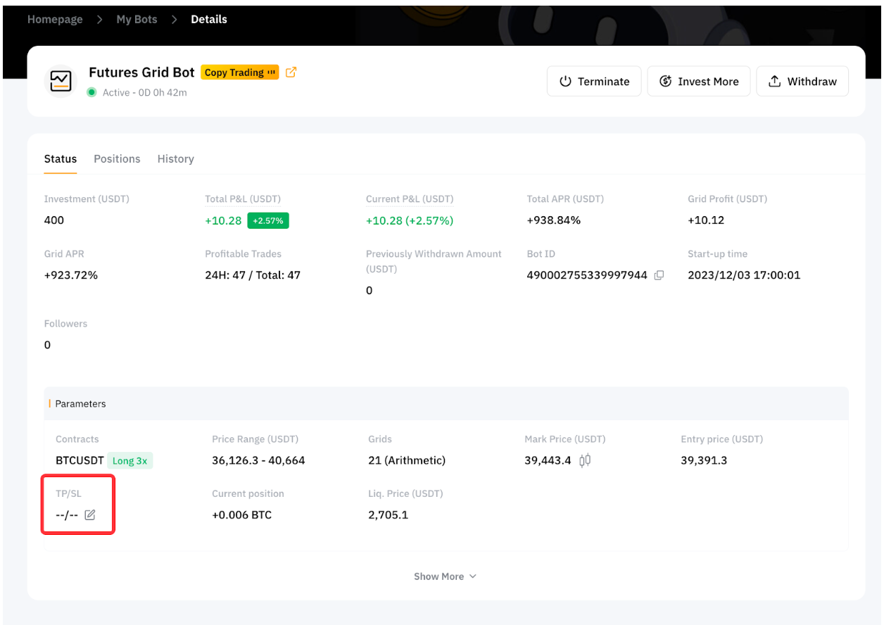 或者,您还可以在机器人详情页面中设置运行中机器人的止盈止损。请注意,向您的机器人追加资金或提现收益都将影响止盈止损比例的计算。欲了解详情,请参阅合约网格机器人常见问题解答