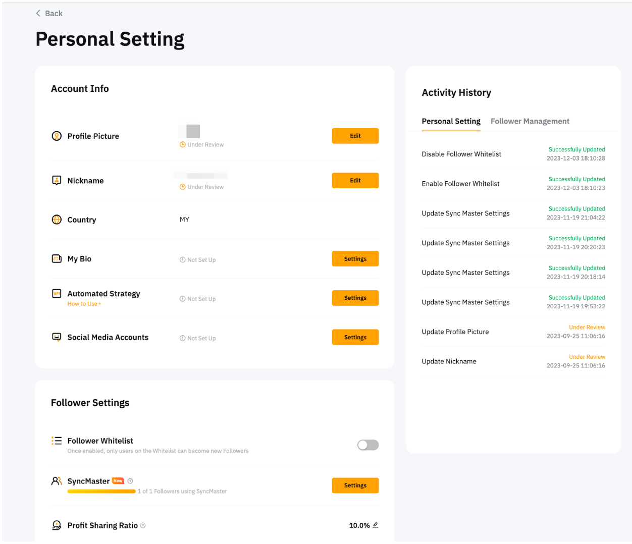 要前往您的个人设置页面,请点击我的带单交易 → 编辑个人资料,即可管理您的账户信息、跟单设置和隐私设置。请注意,账户信息的任何更新均需 1–3 个工作日审批。