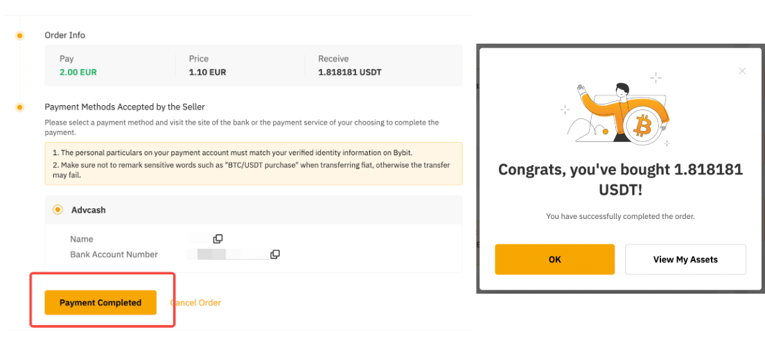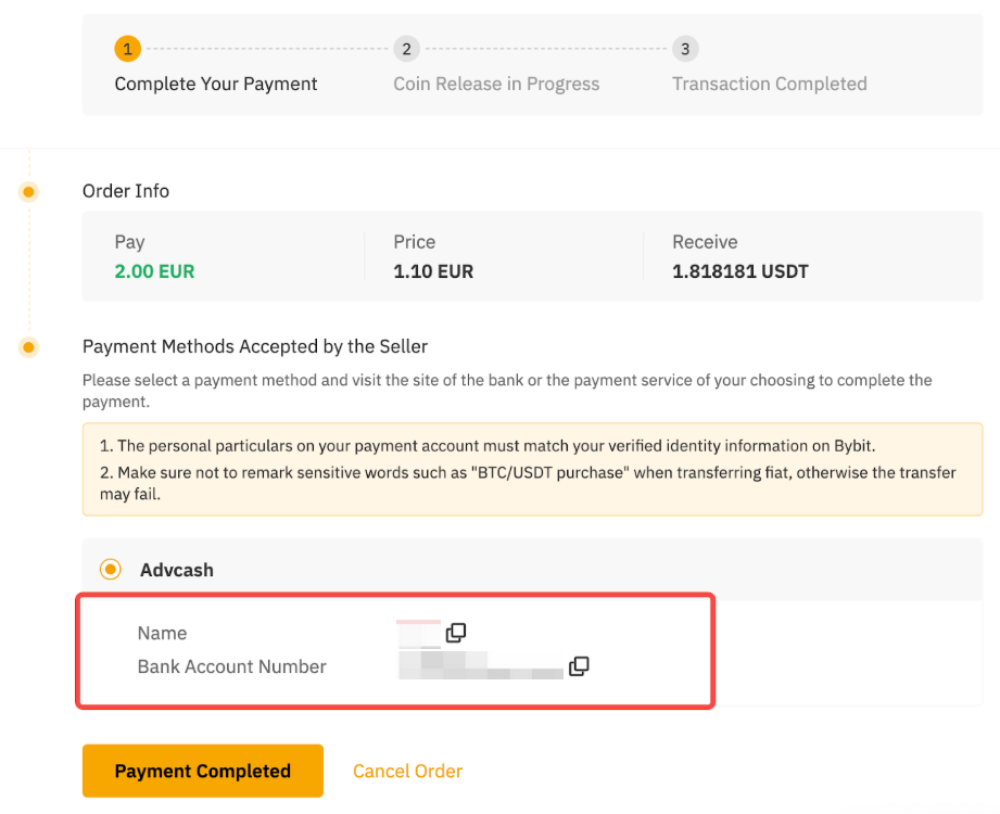 — 您银行账户上的姓名必须与您在 Bybit 上注册的姓名一致。否则,广告商可能取消订单并退款。