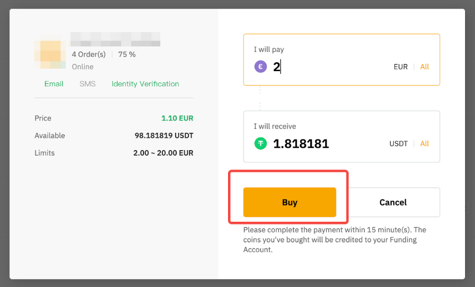 您将被重定向到订单页面,在此您需要在指定时间内将您的法币转入卖家的银行账户。请在继续操作之前验证您的所有订单详情是否正确。