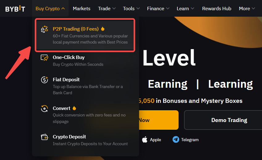 第 1 步:点击左上角导航栏的买币 → P2P 交易,进入 P2P 交易页面。