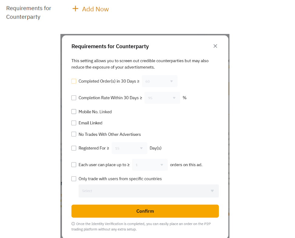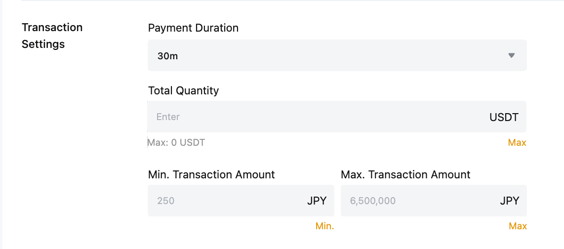 - 如需详细了解每个广告可交易的 USDT 最低和最高金额,请参阅 P2P 订单限制。