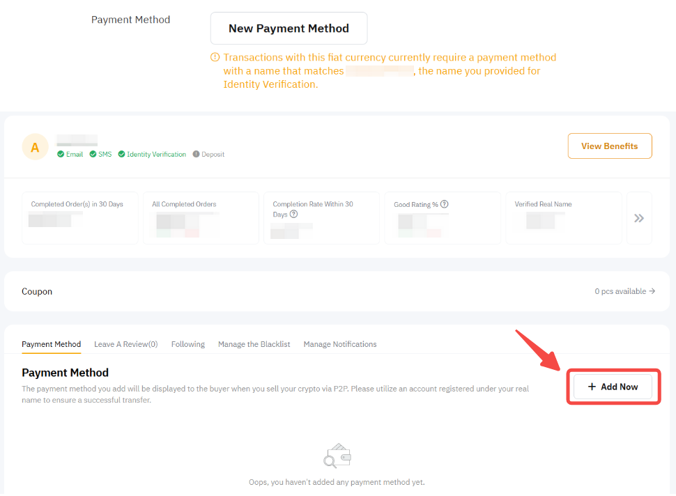 点击 管理付款方式,您将被引导至P2P用户心中,以新增您的付款方式。