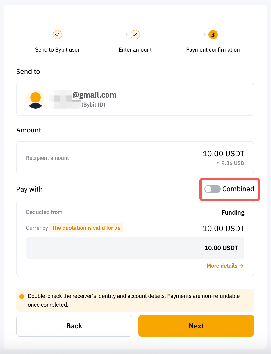 第 2 步:选择内部转账付款方式。您可以输入以下账户信息付款给其他 Bybit Pay 用户: