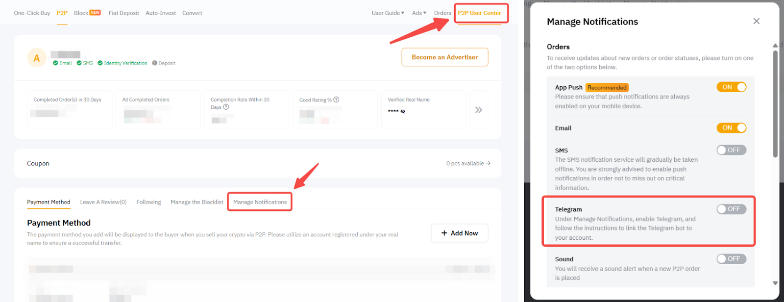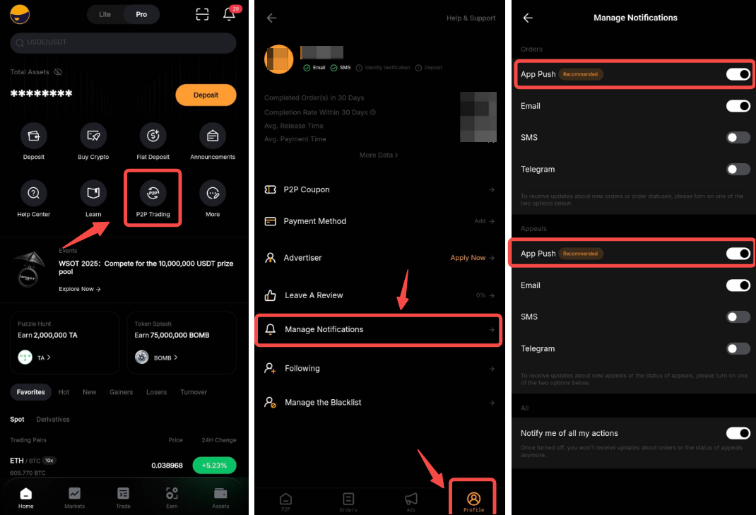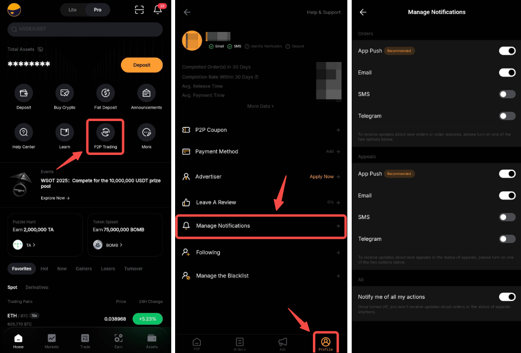 您可以通过 P2P P2P 用户中心控制 P2P 订单和申诉的 App push、Telegram、邮件和短信通知。
