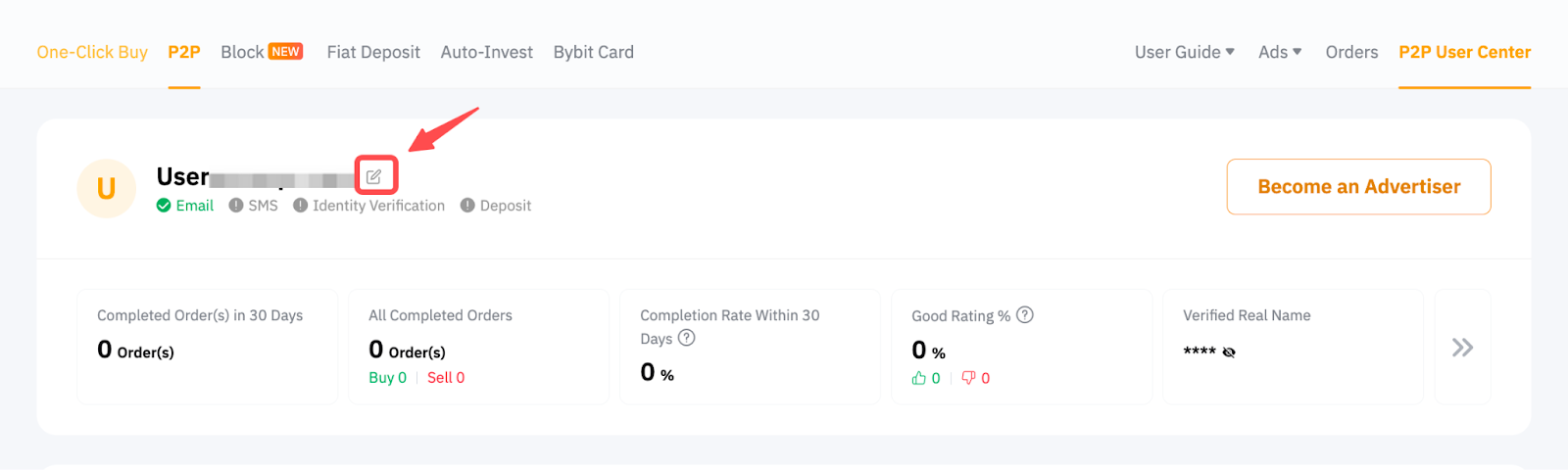 您可以点击 P2P 用户中心上的铅笔图标设置昵称。但请注意,不允许使用空格、特殊字符和表情符号。