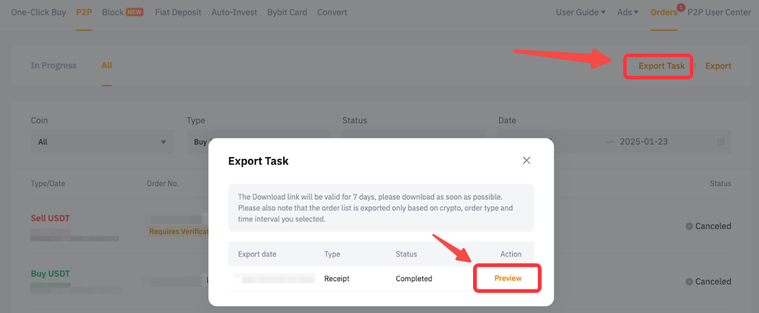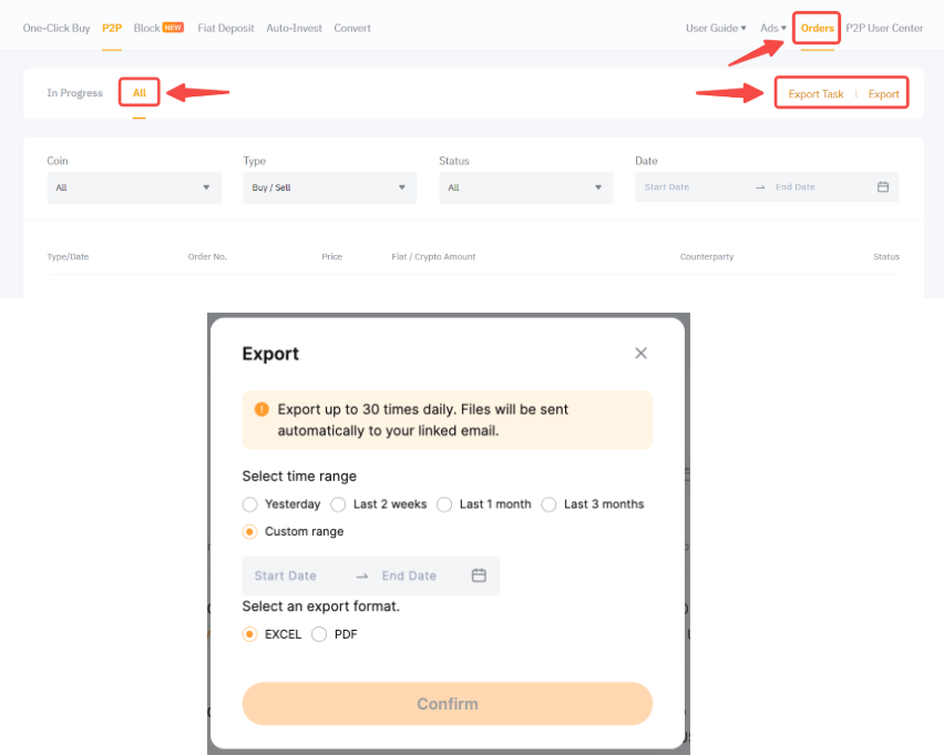 您可以从订单页面导出您的 P2P 订单记录,导出的文件将发送到您的电子邮箱。请检查您的收件箱并从那里下载。