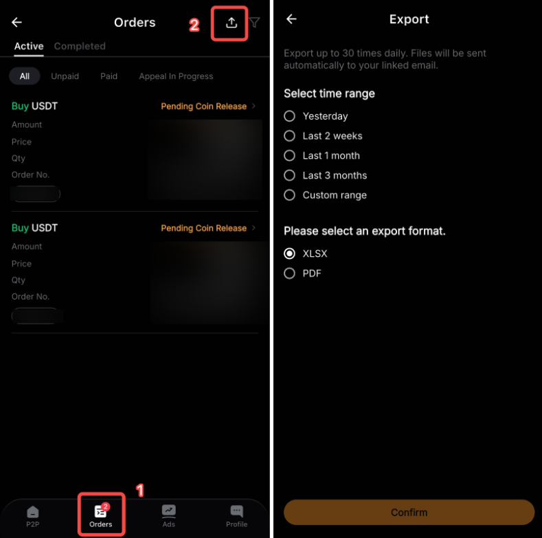 在 App 端,前往P2P 交易 → 订单,然后点击导出图标。然后,选择导出的时间范围和格式。