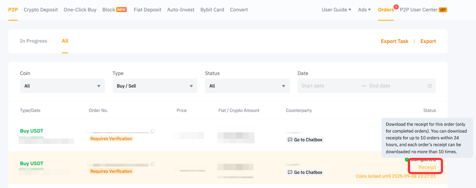 是的,您可以通过点击订单列表页面上的收据下载 P2P 订单记录。下载功能适用于已完成的订单,收据只能从 Bybit 网站下载。