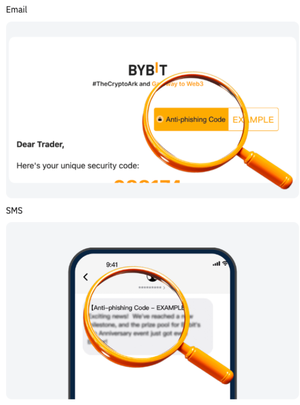 Bybit 的反网络钓鱼代码是一种个性化的安全功能,由字母、数字和符号的独特组合组成。启用后,此代码将出现在来自 Bybit 的所有官方电子邮件和文本消息中,以便您轻松验证所接收信息的真实性。