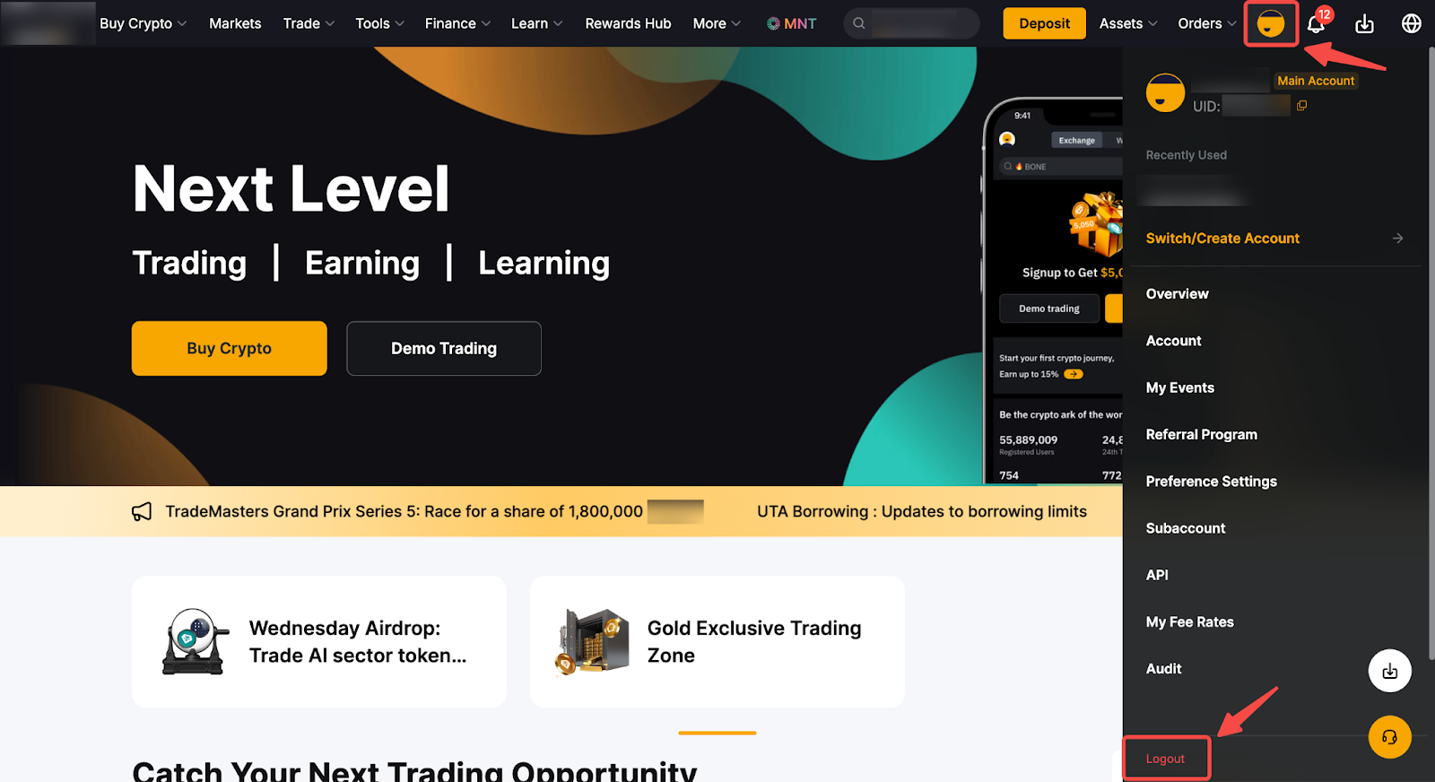 要通过应用程序登出您的 Bybit 帐户,您可以转到您的用户中心,然后单击登出选项卡。对于网站,您可以点击右上角的个人资料图标(步骤 1),然后点击登出选项卡(步骤 2)。