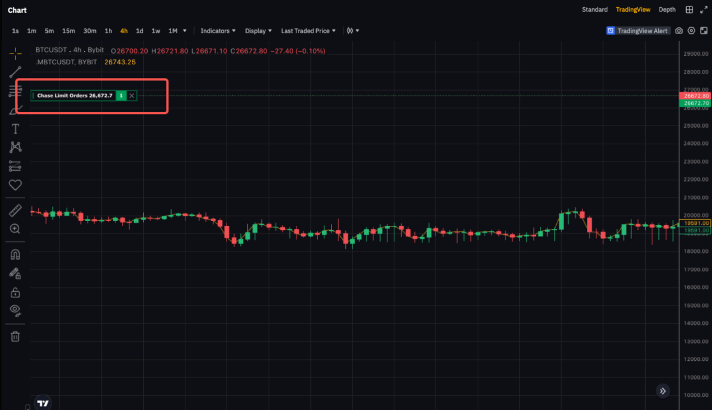 提交後,訂單將在圖表上標記為追逐限價單,可與其他限價單或市價單區分開來。