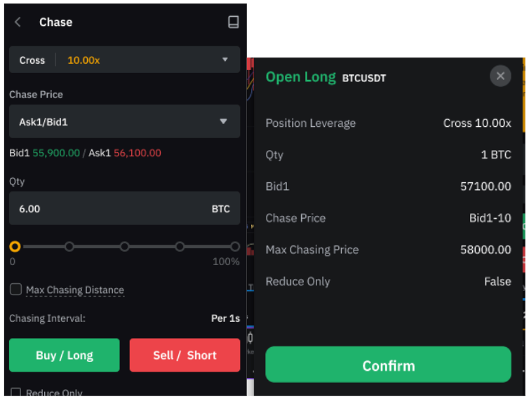 使用追逐限價單時,交易者可以將追逐價格設置為買一價/賣一價,也可以設置固定的買一價/賣一價追逐距離。該距離以價格或比例表示,應介於買一價/賣一價與訂單價格之間。隨後,平台將不斷調整追逐價格以維持預設的追逐價格,直至訂單成交、取消或達到最大追逐距離。
