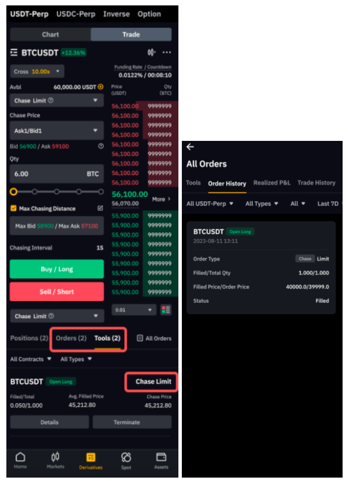 若您使用的是 Bybit App,請前往衍生品頁面,輕點訂單類型下拉列表,然後選擇追逐限價單