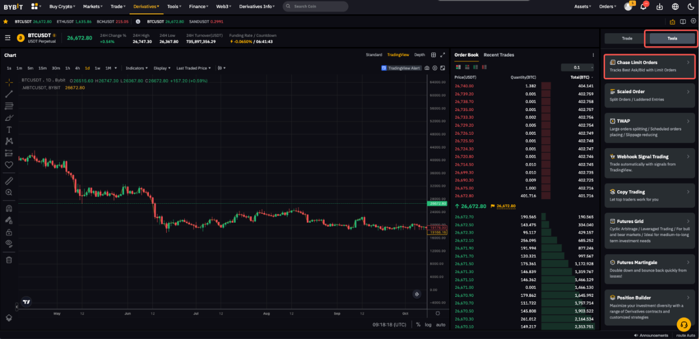 第 3 步:若您使用的是 Bybit 網頁端,請點擊工具選項卡,然後選擇追逐限價單
