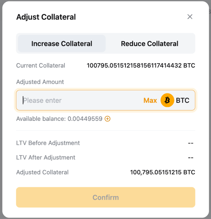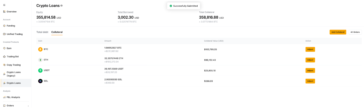 或者,點擊頁面右上角的資產→質押借幣。在質押借幣標籤下,按一下您要調整的列中的調整抵押品金額。