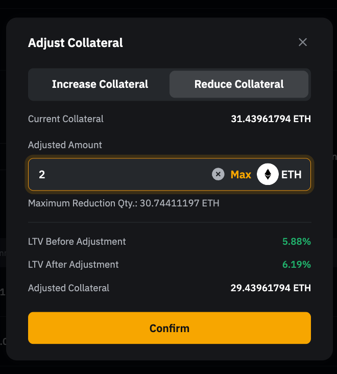追加保證金 LTV:當 LTV 高於追加保證金 LTV 時,您會收到電子郵件、短信和推送通知,提醒您將更多的抵押品存入或轉移到統一交易賬戶或資金賬戶,或償還借入的代幣來降低您的 LTV。
