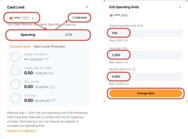 في الأعلى، اختر البطاقة ونوع الحد الذي تريد تحديثه: الإنفاق أو الصراف الآلي. انقر تحرير الحد لتعديل حد المعاملة الواحدة (إن وجد)/اليومي/الشهري وانقر التغيير الآن لتطبيق التغييرات.