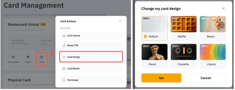يرجى التوجه إلى صفحة إدارة البطاقة، انقر فوق المزيد, واختر تصميم البطاقة. سيتم توجيهك إلى معرض لتصميمات البطاقات الافتراضية المتاحة. تصفح من خلال الخيارات، اختر التصميم المفضل لديك وانقر على تعيين.