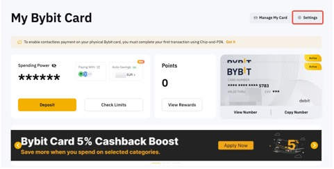 الخطوة 1: اذهب إلى صفحة بطاقتي Bybit وانقر على الإعدادات.