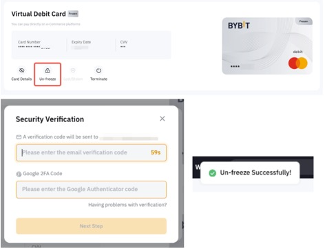 لإعادة تفعيل بطاقة Bybit الخاصة بك، اضغط على إلغاء التجميد وأكمل التحقق الأمني للتأكيد على الإجراء.