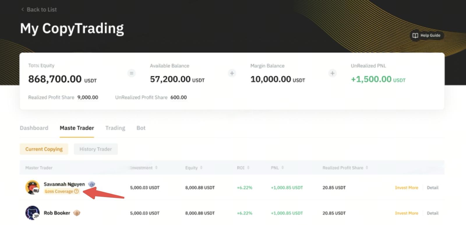 1. إذا كان لدى المتداول الرائد صفقات مفتوحة بالفعل وكان جايسون يتكبد خسارة قدرها 10 USDT، ثم يطالب بقسيمة الحماية المتميزة.