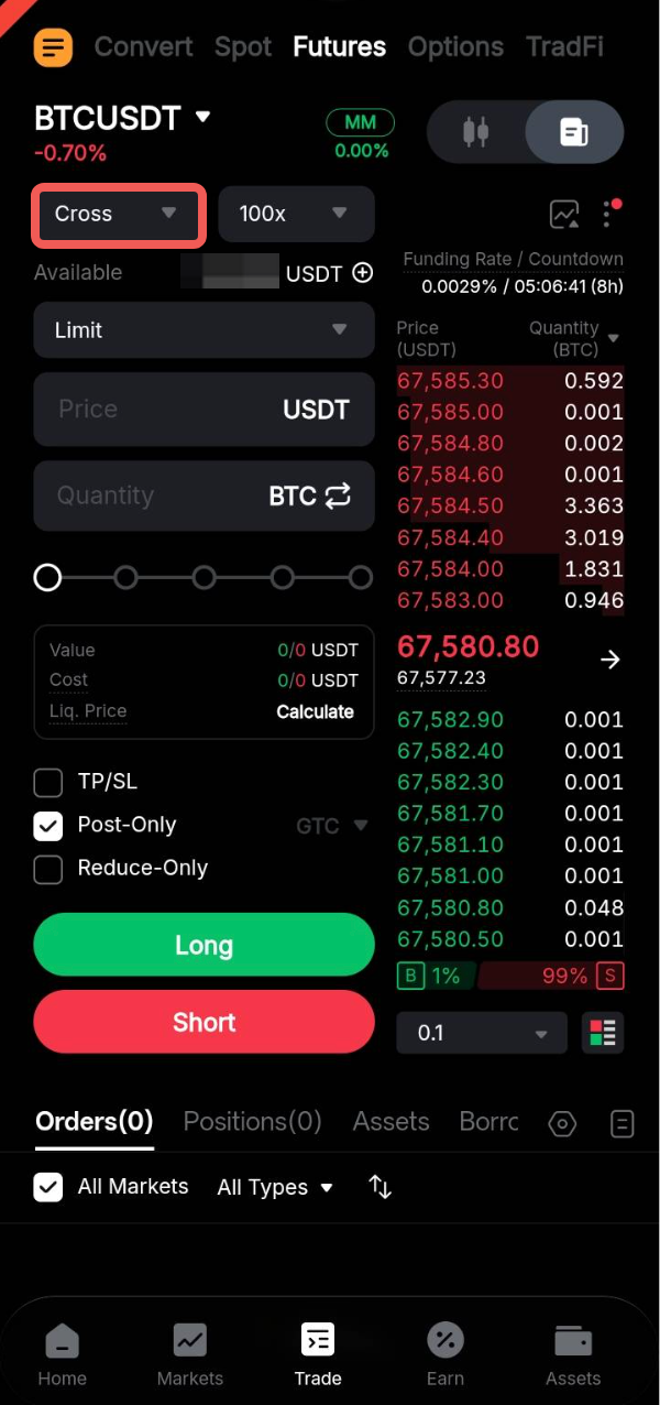 يمكنك تبديل وضع الهامش من أي صفحة تداول أو من صفحة أصول حساب التداول الموحد. يرجى الملاحظة أنه للتبديل إلى وضع هامش العبور، يجب أن تكون التأثير وحدود المخاطر للمراكز ثنائية الاتجاه (المراكز طويلة وشورت) متساوية. وإلا سيفشل التبديل. للمزيد من المعلومات، يرجى الرجوع إلى المعايير لتبديل أوضاع الهامش المذكورة هنا.