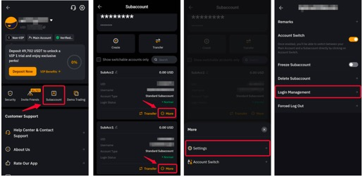 يرجى ملاحظة أنه إذا قمت بإنشاء حساب فرعي قياسي بدون إعدادات كلمة مرور، يمكنك تسجيل الدخول فقط عبر تبديل الحساب من حسابك الرئيسي. لتفعيل تسجيل الدخول عبر صفحة تسجيل الدخول في Bybit، يرجى الاتصال بحسابك الرئيسي، وفي صفحة الحساب الفرعي، حدد حسابك الفرعي واضغط على المزيد → الإعدادات → إدارة تسجيل الدخول. يمكنك الآن استرجاع اسم مستخدم الحساب الفرعي وتعيين كلمة مرور جديدة.
